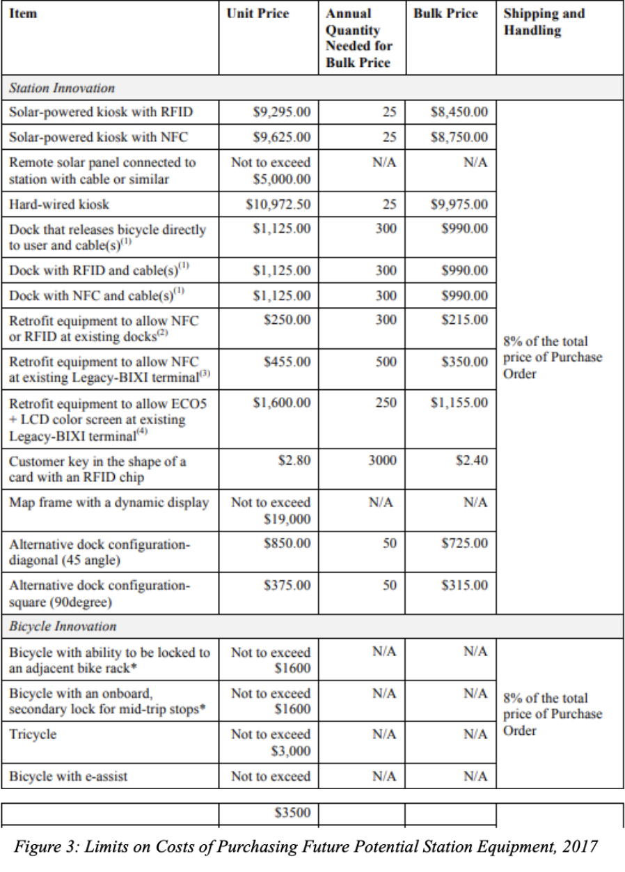 Below is an image of the list of costs of various items in the 2017 contract with Motivate. These values are not adjusted to inflation. These were received in a public records request made on November 3rd, 2025.